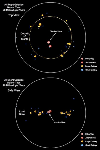 "Todas as galáxias brilhantes a menos de 20 milhões de anos-luz, incluindo a nossa, estão organizadas numa Folha Local com 34 milhões de anos-luz de diâmetro e apenas 1,5 milhões de anos-luz de espessura", diz McCall. "A Via Láctea e Andrómeda estão cercadas por doze grandes galáxias dispostas num anel com cerca de 24 milhões de anos-luz de diâmetro - este Conselho de Gigantes restringe o raio de influência do Grupo Local".