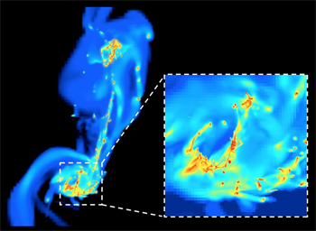 Um frame da simulação das duas galáxias Antena em colisão. Aqui, a forma das galáxias é alterada após o seu primeiro encontro. A alta resolução permite aos astrofísicos explorarem os mais pequenos detalhes. As estrelas formam-se nas regiões mais densas (amarelo e vermelho) sob o efeito da turbulência de compressão. A formação de estrelas é aqui mais intensa que em galáxias normais, como a Via Láctea. Crédito: F. Renaud/CEA-Sap.