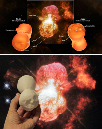 Em cima: Um novo modelo da Nebulosa de Homunculus revela protuberâncias, valas, buracos e irregularidades na emissão de hidrogénio molecular. As protuberâncias surgem perto de uma espécie de saia de poeira observada em luz visível no centro da nebulosa, mas que não foi encontrada neste estudo, pelo que constituem estruturas diferentes. Crédito: NASA Goddard Space Flight Center. Inserções: NASA, ESA, Hubble SM4 ERO Team. Em baixo: Um modelo 3D impresso da Nebulosa de Homunculus é comparado a uma imagem do objecto do telescópio espacial Hubble. Crédito: NASA Goddard Space Flight Center/Ed Campion.