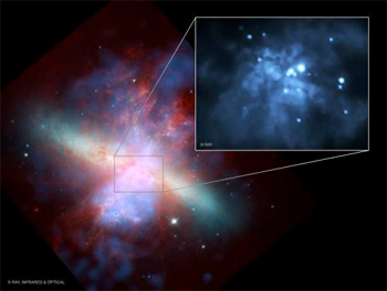 Esta imagem da galáxia M82 é uma composição de dados do Chandra, do Telescópio Espacial Hubble e do Telescópio Espacial Spitzer. O buraco negro de massa intermédia, M82 X-1, é o objecto mais brilhante na inserção, perto do centro da galáxia. Crédito: NASA / H. Feng et al.