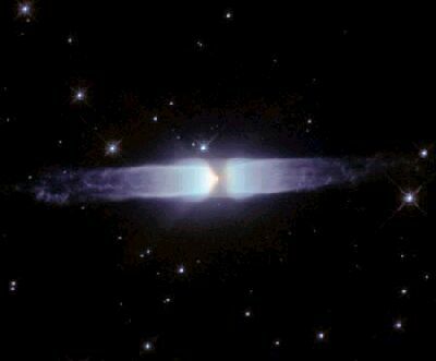 . Como se pode ver na imagem ao lado, distinguem-se dois fluxos de matéria em sentido oposto, com forma de cilindros alongados e de aspecto filamentosos. Pela primeira vez, vê-se a estrela central responsável por esta nebulosa.