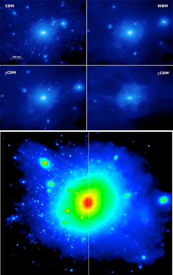 Em cima: A distribuição simulada de matéria escura numa galáxia como a Via Láctea nos casos de: matéria escura não interagindo (canto superior esquerdo), matéria escura quente (canto superior direito), e novo modelo de matéria escura interagindo com os fotões de fundo (em baixo). As estruturas menores desaparecem até ao ponto em que, no modelo mais extremo (canto inferior direito), a galáxia fica completamente isolada. Crédito: Universidade de Durham. Em baixo: Dois modelos de distribuição de matéria escura no halo de uma galáxia como a Via Láctea, separados pela linha branca. As cores representam a densidade de matéria escura, com o vermelho a indicar alta densidade e o azul baixa densidade. À esquerda, uma simulação de como a matéria escura fria não interagindo produz uma abundância de pequenas galáxias satélite. À direita, a simulação mostra a situação em que a interacção da matéria escura com outras partículas reduz o número de galáxias satélite que se esperaria observar em torno da Via Láctea. Crédito: Universidade de Durham.