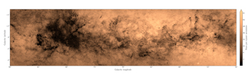 (nuvens de gás incandescente) encontradas em maior número dentro do disco da Via Láctea. O mapa de densidade estelar ilustrado aqui resulta da banda de comprimentos de ondaUma nebulosa é uma nuvem de gás e poeira interestelares.