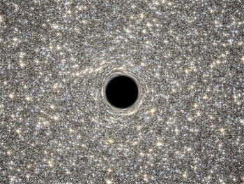 Ilustração de um buraco negro de grande massa, pesando até 21 milhões de sóis, localizado no centro da galáxia ultra densa M60-UCD1. A galáxia anã é tão densa que um visitante imaginário veria no céu mais de um milhão de estrelas. Como nenhuma luz pode escapar do buraco negro, ele surge simplesmente em silhueta contra o fundo estrelado. O campo gravitacional intenso do buraco negro distorce a luz das estrelas de fundo formando imagens em forma de anel junto à margem escura do horizonte de eventos. Crédito: NASA, ESA, and D. Coe and G. Bacon (STScI).