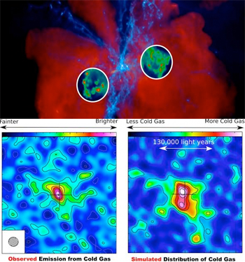 Em cima: ilustração do fluxo de saída (vermelho) e do gás que flui para o quasar no centro (azul). Os aglomerados frios que aparecem nas inserções são expelidos da galáxia numa tempestade de granizo galáctica. Crédito: Tiago Costa. Em baixo: comparação do fluxo de saída – observação de telescópio (esquerda) e simulação de computador (direita). Crédito: Tiago Costa.