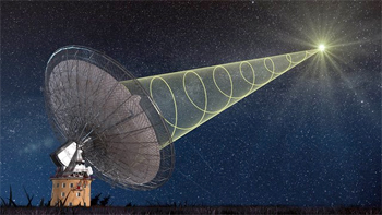 Representação esquemática do radiotelescópio Parkes do CSIRO a receber o sinal polarizado da nova explosão de rádio rápida. Crédito: Swinburne Astronomy Productions.