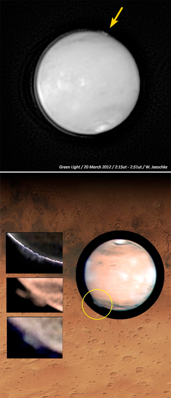 Em cima: Observação da pluma misteriosa (marcada com a seta amarela) no limbo de Marte, a 20 de Março de 2012, realizada pelo astrónomo W. Jaeschke. Na imagem, o pólo norte está virado baixo e o pólo sul para cima. Crédito: W. Jaeschke. Em baixo: à direita, o local da pluma é identificado no círculo amarelo. À esquerda, vistas aproximadas da mudança de morfologia da pluma em imagens obtidas por W. Jaeschke e D. Parker, a 21 de Março de 2012. O fundo é uma região de Marte conhecida como Terra Cimmeria, onde a pluma se formou. Crédito: W. Jaeschke and D. Parker.