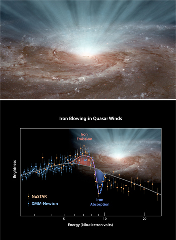 de ferro (que são transportados pelos ventos juntamente com outra matéria) apenas directamente à frente do buraco negro, onde bloqueiam os raios-X. Os cientistas combinaram os dados do NuSTAR, de raios-X de maior energia, com as observações do XMM-Newton e, deste modo, foram capazes de encontrar assinaturas de ferro dispersas, provando que os ventos emanam do buraco negro não numa direcção única, mas de forma quase esférica.