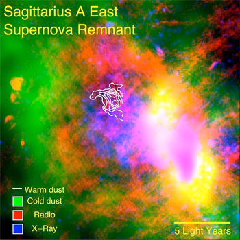 Dados do SOFIA revelam poeira quente (branco) a sobreviver dentro de um remanescente de supernova. A nuvem SNR Sgr A Leste é mostrada em raios-X (azul). A emissão de rádio (vermelho) mostra as ondas de choque em expansão a colidirem com nuvens interstelares circundantes (verde). Crédito: NASA/CXO/Herschel/VLA/Lau et al.