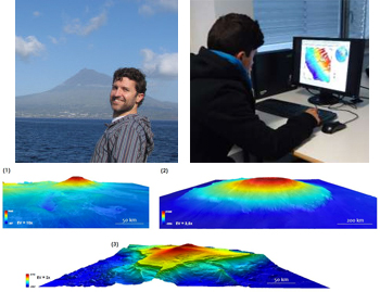 Em cima, à esquerda: Hélder Pereira; em cima, à direita: um aluno a analisar um modelo digital de terreno utilizando software livre. Em baixo: morfologia em 3D de três vulcões tipo escudo: (1) Maat Mons, em Vénus, (2) Olympus Mons, em Marte, e (3) na ilha grande do arquipélago do Havai, Terra. Crédito: Hélder Pereira