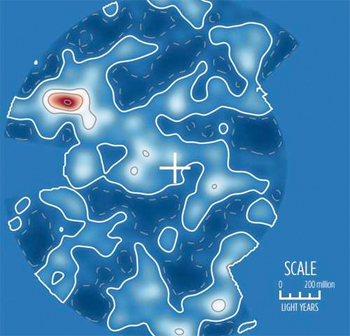 Um pedaço do mapa 3D do Universo próximo. A Via Láctea está ao centro, marcada por uma cruz. O mapa abrange quase dois mil milhões de anos-luz. As regiões com maior número de galáxias surgem a branco ou vermelho e as com menor número surgem a azul escuro.