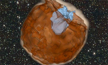 Imagem de uma simulação de supernova de Tipo Ia. Na simulação, uma supernova de Tipo Ia explode (castanho-escuro). O material da supernova é ejectado com uma velocidade de cerca de 10000 km/s e colide com a sua estrela companheira (azul-claro). A violenta colisão produz um sinal de radiação ultravioleta que é emitido a partir do orifício cónico esculpido pela estrela companheira. Crédito: Dan Kasen.