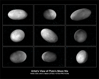 Este conjunto de ilustrações de lua de Plutão Nix mostra como a orientação da lua muda de forma imprevisível, à medida que orbita o sistema Plutão-Caronte. As ilustrações têm por base uma simulação em computador, que calculou o movimento desorganizado das quatro luas mais pequenas do sistema Plutão-Caronte. Os astrónomos usaram esta simulação para tentar compreender as mudanças imprevistas na luz reflectida de Nix. Descobriram ainda que a lua de Plutão Hidra também sofre uma rotação caótica. A forma alongada de ambas as luas contribui para o seu movimento imprevisível. Crédito: NASA, ESA, M. Showalter (SETI Inst.), G. Bacon (STScI).