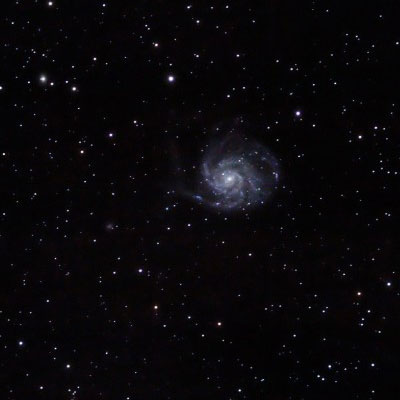 Hoje apresentamos-lhe de novo a galáxia M 101, mas desta vez com uma escala diferente. Esta imagem de grande campo obtida pelo astrónomo amador Filipe Alves não mostra o detalhe observado na imagem de ontem, mas por outro lado podemos observar como a galáxia coexiste com um extenso campo de estrelas, e podemos observar de forma mais realista como esta galáxia aparece na ocular. No entanto, apesar de podermos observar cor nesta imagem, a luz que chega ao olho de um observador é tão pouca que não é possível discernir as diferentes tonalidades que se podem aqui observar.