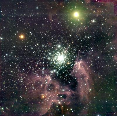 NGC 3603 encontra-se localizado no braço espiral de Carina (a Quilha do Navio), na Via Láctea, a uma distância de cerca de 20 000 anos-luz (entre 6 e 7 kpc). Trata-se da única região de hidrogénio ionizado (que os astrónomos apelidam de regiões HII) de massa elevada na nossa galáxia na qual um aglomerado central, composto por inúmeras estrelas quentes que emitem fortemente radiação ultravioleta que ioniza o gás da nebulosa em sua volta, pode ser estudado quer no óptico quer no infravermelho. Isto porque a linha de visão na direcção do aglomerado é razoavelmente desprovida de poeira. No infravermelho, a poeira bloqueia fracamente a luz, apenas dum factor de 2, ao contrário do factor de cerca de 80 na banda do visível. A massa total das estrelas de classe espectral O e B em NGC 3603 é superior a 2000 massas solares. As mais de 50 estrelas quentes e de massa elevada de classe espectral O, presentes nesta região, possuem um poder ionizante de cerca de 100 vezes o poder das estrelas do aglomerado do Trapézio, na Grande Nebulosa de Orionte (M 42). À distância de NGC 3603, cada lado desta imagem, obtida em 1999 em três bandas infravermelhas, cobre uma extensão de 20 anos-luz.