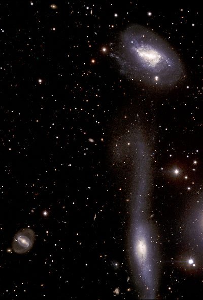 Em baixo, do lado esquerdo, uma peculiar galáxia espiral barrada observa a interacção das suas duas vizinhas. Este par tem sido alvo de particular interesse devido à presença de supernovas, explosões de estrelas que podem despoletar, depois, o nascimento de novas estrelas.