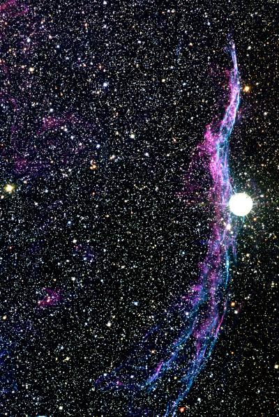 A Nebulosa do Véu é uma enorme região de gás difuso, cobrindo vários graus no céu, a uma distância de cerca de 2500 anos-luz, na constelação do Cisne. Esta imagem, apesar de abranger mais de um grau no céu (correspondendo a mais de 40 anos-luz à distância a que se encontra a nebulosa), consegue apenas mostrar a parte oeste da nebulosa, catalogada NGC 6960. Na sua totalidade, a nebulosa estende-se por mais de 100 anos-luz. Trata-se de um remanescente de supernova, cuja supernova terá explodido há mais de 20 000 anos. É composto por material interestelar que foi arrastado pela onda de choque da explosão. O gás desta nebulosa emite ainda fortemente devido ao facto do gás se encontrar excitado, fruto da colisão da onda de choque, que se propaga, com o meio interestelar. Esta nebulosa emite também raios-X, embora a sua emissão seja mais fraca do que noutros remanescentes de supernova, como Cassiopeia A, que é mais recente. A imagem foi obtida em 1996 pelo telescópio Schmidt, pertencente ao Observatório Warner e Swasey da Case Western Reserve University (CWRU), situado no Observatório Nacional de Kitt Peak, no Arizona (EUA).