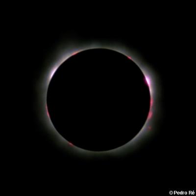 A 11 de Agosto de 1999, milhões de espectadores testemunharam a Lua a entrepor-se directamente entre a Terra e o Sol. Os europeus privilegiados que se encontravam numa estreita faixa de cerca de 100 km que atravessava a Europa Central estiveram em condições de observar um eclipse total; no resto da Europa pôde-se observar um eclipse parcial. Infelizmente, o tempo não ajudou e em muitos locais (foi o caso de Paris, por exemplo) as nuvens estragaram o momento. Esta fotografia foi obtida em Bucareste (Roménia), com um refractor Konus de 80 mm, por Pedro Ré, um sobejamente conhecido astrónomo amador e Professor Associado do Departamento de Zoologia e Antropologia da Faculdade de Ciências da Universidade de Lisboa. Nesta imagem pode ver-se claramente um conjunto de protuberâncias (em tons rosados), um fenómeno comum da cromosfera solar. Bucareste, localizada no centro da faixa de totalidade, foi um dos locais onde o eclipse observado teve maior duração, 2 minutos e 22 segundos. Na Europa, este foi o último eclipse total observado no século XX.