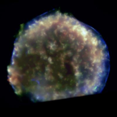Esta é uma imagem dos restos turbulentos criados pela explosão da supernova observada pelo astrónomo dinamarquês Tycho Brahe, em 1572. Também conhecida por SN 1572, encontra-se a 7500 anos-luz, na constelação da Cassiopeia. As cores mostram os diferentes níveis de energia de raios-X: vermelho, verde e azul representam baixa, média e alta energia, respectivamente. O corte em baixo deve-se a que a região mais a Sul do remanescente de supernova encontra-se fora do campo de visão do detector. O remanescente de supernova expande-se criando uma onda de choque, cujo contorno é formado por gás a 20 milhões de graus Celsius, que aparece na imagem como arcos circulares azuis, muito brilhantes. Os restos estelares estão a uma temperatura de cerca de 10 milhões de graus e só são visíveis em raios-X; na imagem aparecem como uma mancha pintalgada por dedos amarelos, verdes e vermelhos de gás. Não se detecta uma fonte central neste remanescente, o que é consistente com outras evidências de que a supernova de Tycho é uma supernova do tipo Ia – resulta da explosão de uma anã branca pertencente a um sistema binário quando a sua massa ultrapassa o limite de Chandrasekhar, devido a ter roubado matéria à sua companheira.
