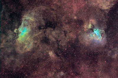 Para a obtenção desta imagem, o astro-fotógrafo Russell Croman (http://www.rc-astro.com/ ) usou filtros destinados a isolar a luz emitida por átomos de enxofre, hidrogénio e oxigénio. Estes átomos são excitados pela radiação emitida por estrelas jovens no interior das nebulosas. A nebulosa da Águia, visível do lado esquerdo, situa-se a cerca de 7000 anos-luz de distância. A nebulosa do Cisne, do lado direito da imagem, situa-se um pouco mais perto da Terra, a cerca de 5000 anos-luz de distância.