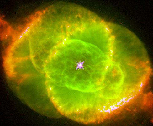 Esta nebulosa planetária, designada por NGC 6543 mas popularmente conhecida por nebulosa Olho de Gato, situa-se na constelação do Dragão, à distância de 3000 anos-luz. Com uma idade estimada de 1000 anos, esta é uma das nebulosas planetárias mais complexas que se conhecem. Esta imagem obtida com o Telescópio Espacial Hubble revela estruturas complicadas, como esferas de gás concêntricas, jactos de gás a alta velocidade e zonas de choque. Uma análise inicial revelou que no centro da nebulosa poderá estar um sistema de estrelas duplo, responsável pela forma intrincada adoptada pelo gás em expansão. As nebulosas planetárias nada têm a ver com a formação de planetas, ao contrário do que o nome parece indicar. Elas são o produto dos estágios finais de estrelas como o Sol, que, ao terminarem a sua vida, expelem para o exterior as suas camadas.