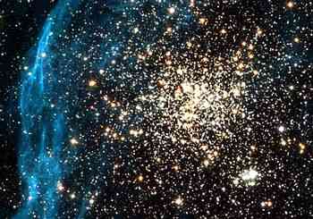 O enxame duplo visível na imagem é conhecido por NGC 1850 e localiza-se na nossa galáxia vizinha Grande Nuvem de Magalhães. Este enxame encontra-se rodeado por um véu difuso de gás que se julga que se terá formado devido à explosão de estrelas de massa elevada. Este enxame duplo é formado por dois agregados de estrelas jovens, um visível na região central desta imagem obtida pelo Hubble, constituído por estrelas jovens com cerca de 50 milhões de anos idade, e outro visível na parte inferior direita, constituído por estrelas com apenas 4 milhões de anos. Esta imagem é um bom exemplo da interacção existente entre gás, poeira e estrelas. Julga-se que, há milhões de anos atrás, estrelas de massa elevada terão explodido sob a forma de supernovas, dando origem ao véu de gás visível na imagem. Pensa-se que as ondas de choque provocadas pelas supernovas poderão ser responsáveis pela fragmentação e compressão do gás, criando assim condições para a formação de novas estrelas.