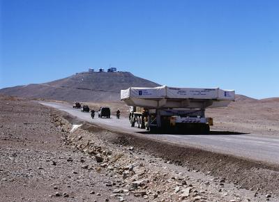 Esta fotografia, obtida a 9 de Dezembro de 1997, mostra o primeiro dos quatro espelhos de 8,2 m do VLT a ser transportado para o topo do Cerro Paranal (Chile), no qual se podem ver as cúpulas já construídas. Cada um dos espelhos tem uma espessura máxima de cerca de 20 cm, no bordo, e pesa 23,5 toneladas. À frente desta caravana, seguiam 3 buldózeres com cilindros (que não se vêem nesta imagem) para garantir um piso aplanado, de modo que do chão não pudesse surgir nenhum problema para o camião que transportava a preciosa carga. Para o transporte deste espelho, desde o porto de Antofagasta até ao observatório Paranal, a apenas 120 km de distância, foram necessários dois dias! Cada um dos espelhos do VLT possui uma superfície com cerca de 53 metros quadrados. São de tal forma perfeitos que as medições efectuadas da curvatura das suas superfícies mostraram que as imperfeições são inferiores a 0,00005 milímetros. Isto corresponde a termos apenas um único desvio de 1 mm numa área circular cujo diâmetro é de 165 km!