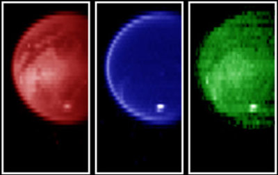 Observando nos comprimentos de onda do infra-vermelho próximo que permitem penetrar a densa atmosfera, estas imagens, obtidas pela sonda Cassini, permitem observar a superfície de Titã com uma clareza invulgar. A imagem da esquerda, obtida no comprimento de onda de 2µm, e a imagem da direita, obtida a 5µm, permitem detectar uma variedade de características da superfície. As zonas mais escuras são possivelmente constituídas por gelo (de água) relativamente puro, enquanto que nas zonas mais claras a abundância de outros compostos, como hidrocarbonetos simples, deverá ser mais elevada. A imagem do meio, obtida a 2,8µm mostra uma superfície muito escura, como seria de esperar neste comprimento de onda de uma superfície de gelo de água e hidrocarbonetos. Em todas as imagens é visível perto do Pólo Sul uma nuvem de metano muito brilhante. O facto de ser vísivel em todas as cores indica que deve ser constituida por partículas maiores do que as que compõem a bruma que envolve Titã. Ainda na imagem da esquerda parece entrever-se uma estrutura circular no hemisfério Norte, que poderá ser uma cratera.