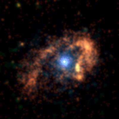 Esta imagem em raios-X de Eta Carinae, η Car, mostra três estruturas distintas, que representam ondas de choque produzidas pela matéria que se afasta a velocidades supersónicas: um anel exterior em forma de ferradura, com cerca de 2 anos-luz de diâmetro e uma temperatura de 3 milhões de graus; uma núcleo azul quente, com cerca de 3 meses-luz; e uma fonte central com menos de um mês-luz de diâmetro, a uma temperatura de 60 milhões de graus, e que contém a superestrela. A região central parece estar associada a um disco central de gás de alta velocidade que se expande perpendicular aos lóbulos de gás observados no óptico. A cerca de 8000 anos-luz, na constelação da Quilha, η Car é a estrela mais luminosa que se conhece na nossa Galáxia, mas também a mais misteriosa. Muitos defendem que no seu coração se encontra uma estrela de massa muito elevada, talvez com mais de 100 vezes a massa do Sol, perto do limite teórico para uma estrela. Antes de terminar a sua vida com uma explosão de supernova, instabilidades violentas provocam erupções na estrela e as camadas mais exteriores são expelidas. Recentemente, a descoberta de um ciclo de 5,5 anos na radiação X e nos ultravioletas levou à proposta de que se trata de um sistema binário, em que a forte radiação X se deve à colisão dos ventos estelares densos emanados por duas estrelas em interacção próxima.