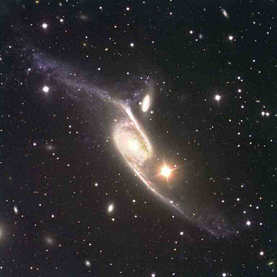 Esta imagem, obtida em 1999, mostra a espectacular galáxia espiral com barra NGC 6872, cuja forma lembra a letra "S". É uma galáxia do tipo SBb e está a interagir com outra galáxia mais pequena, IC 4970, do tipo S0, visível acima do centro da imagem. O braço espiral de NGC 6872 que se encontra do lado superior esquerdo da imagem apresenta inúmeras regiões em tons azulados, muitas das quais são, na verdade, regiões de formação de estrelas. É provável que esta actividade de formação estelar em larga escala tenha sido provocada pela passagem recente da galáxia IC 4970. Este sistema pertence à constelação austral do Pavão e encontra-se a uma distância de 300 milhões de anos-luz. A sua extensão no céu é superior a 7 minutos de arco e o seu tamanho físico real são cerca de 750 mil anos-luz. NGC 6872 é, de facto, uma das maiores espirais com barra que se conhece. Nesta imagem pode ainda ver-se muitas outras galáxias, menos brilhantes e mais longínquas.