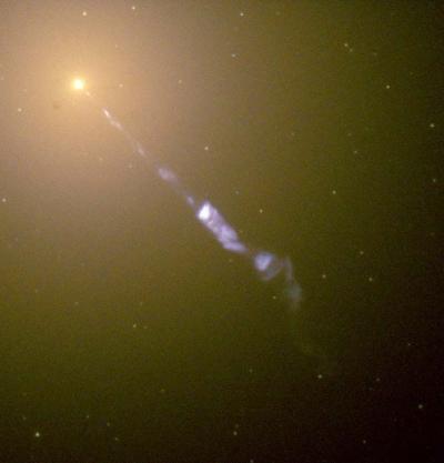 Emanando a alta velocidade a partir do centro da galáxia M 87, este jacto cósmico é um dos fenómenos mais espectaculares da Natureza. Constituído por electrões e outras partículas subatómicas, este jacto, que se desloca quase à velocidade da luz, é alimentado por um buraco negro que reside no centro da galáxia. Numa primeira análise, M 87, também conhecida por NGC 4486, parece ser uma galáxia elíptica gigante normal. Contudo, desde 1918 que se notou a existência de um "raio de luz curioso", emanando do centro de M 87. Na década de 50, quando o ramo da radioastronomia se encontrava em desenvolvimento, foi descoberta uma fonte de rádio extremamente forte associada a M 87 e ao seu jacto. Após décadas de investigação, descobriu-se que a fonte desta actividade intensa é um buraco negro colossal no centro da galáxia, com uma massa de aproximadamente 2 mil milhões de massas solares. M 87 situa-se a cerca de 50 milhões de anos-luz de distância. Apesar de bastante distante, o seu jacto extragaláctico é o mais bem conhecido e estudado.