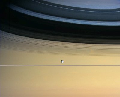 Dione, com 1118 km de diâmetro, é uma das luas de Saturno, a flutuar a cerca de 300000 km dos anéis do planeta gigante. O pequeno satélite é aqui visível contra o fundo da atmosfera de Saturno coberto pelas sombras dos anéis. Mais palavras para quê, trata-se de mais uma fantástica imagem obtida pela sonda Cassini.
