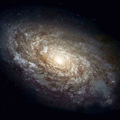 Esta imagem, com um campo de 2,4 minutos de arco de lado, mostra a galáxia espiral NGC 4414, com um diâmetro de 56 mil anos-luz. A galáxia encontra-se à espantosa distância de 62 milhões de anos-luz, na direcção da constelação da Cabeleira de Berenice. Foi a partir da medição rigorosa do brilho de estrelas variáveis em NGC 4414 que se conseguiu medir com precisão a distância à galáxia. Distâncias desta ordem de grandeza são usadas pelos astrónomos para estimar parâmetros como a constante de Hubble, a idade ou a taxa de expansão do Universo. Nesta imagem podemos ver que a parte central da galáxia, como é típico das galáxias espirais, contém essencialmente estrelas velhas de cores amarela e vermelha. Os braços espirais parecem azulados, resultado da formação, em curso, de estrelas jovens, azuis. Os braços espirais são igualmente ricos em nuvens de gás e poeira interestelares, que na imagem aparecem como estruturas escuras contrastadas pelo fundo de luz estelar.