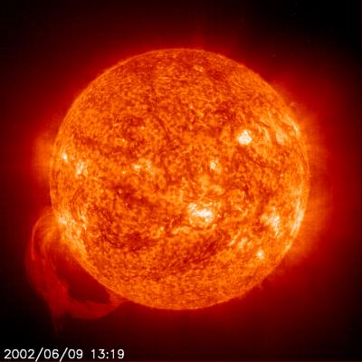 A erupção de uma proeminência longa e arqueada é capturada na luz ultravioleta da risca de emissão de 304 Å do hélio ionizado. Esta é uma das maiores proeminências observadas pelo SOHO. As proeminências são enormes nuvens de plasma relativamente frio e denso, suspensas na coroa quente e ténue do Sol. Campos magnéticos originam forças que provocam a erupção das proeminências, lançando partículas para o exterior da superfície do Sol. Para dar ideia da dimensão da proeminência, ela estende-se, desde uma ponta à outra, por cerca de 50 diâmetros da Terra. Sendo um fenómeno efémero, já tinha desaparecido na imagem seguinte tirada a este comprimento de onda, cerca de 6 horas depois. O instrumento que obteve esta imagem, o EIT, observa o Sol em quatro comprimentos de onda do ultravioleta. Permite assim a comparação do gás a temperaturas diferentes, providenciando mapas diários do tempo no Sol. A emissão desta risca espectral de 304 Å mostra a cromosfera superior a uma temperatura de 60 000 K. As regiões mais quentes aparecem a branco nesta imagem, e as mais frias, a vermelho.
