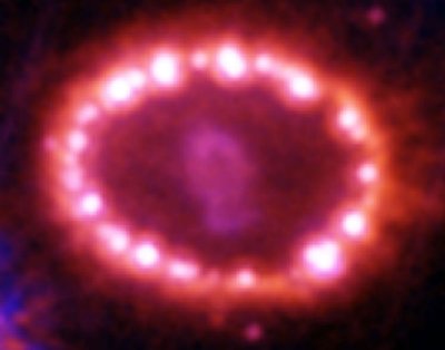 Os restos da mais violenta explosão testemunhada pelo Homem nos últimos anos continuam a impressionar a comunidade astronómica. Esta imagem, obtida pelo telescópio Hubble, mostra o resultado deste evento cataclísmico ao fim de 17 anos. Observada em 1987, a supernova SN1987A continua a fornecer imagens espectaculares como esta. O onda de choque provocada pela supernova continua a colidir com um anel pré-existente de material, dando lugar à formação de regiões extremanente quentes, formando um magnífico "colar de pérolas cósmicas". A SN1987A situa-se na Grande Nuvem de Magalhães, uma galáxia vizinha da nossa situada a 170000 anos-luz de distância, o que significa que a supernova ocorreu, na realidade, não na década de 80, mas há 170000 anos atrás!