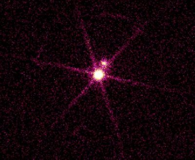 Sírius é a estrela mais brilhante do céu ... sem contar com o Sol, naturalmente. Encontrando-se a 8.7 anos-luz de distância, não é a estrela mais próxima de nós. Esta distinção pertence a Alfa Centauro, a 4 anos-luz de distância. Sírius é intrinsecamente 20 vezes mais luminosa que o nosso Sol, e duas vezes mais maciça. Em 1862 descobriu-se que Sírius é, na realidade, um sistema duplo, sendo a sua companheira, Sírius B, cerca de 10000 menos brilhante que a estrela principal. No entanto, em raios-X, Sírius B é muito mais brilhante como se vê nesta imagem obtida com o satélite Chandra (as linhas radias que emanam de Sírius B são efeitos ópticos na imagem). Sírius B foi a primeira anã branca a ser descoberta e é aquela que mais perto se encontra da Terra. Possui um raio semelhante ao do nosso planeta, mas a sua massa é comparável à do Sol.
