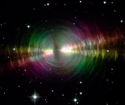 A Nebulosa do Ovo encontra-se a uma distância de 3000 anos-luz, na constelação do Cisne. Esta nebulosa está a entrar na fase de nebulosa planetária e no seu centro encontra-se uma estrela cujo combustível nuclear se esgotou. Agora, a estrela ejecta as suas camadas mais externas, enquanto se transforma numa anã branca. Uma cintura de poeira muito espessa, que atravessa a imagem na diagonal, impede que se veja directamente a estrela central. Mas feixes gémeos de luz escapam da estrela escondida por outras direcções e iluminam a poeira, tal como lanternas numa sala cheia de fumo. A poeira, que reflecte a luz da estrela, forma uma estrutura de anéis concêntricos à volta da estrela que se estende por mais de um décimo de ano-luz. A poeira reflecte luz de forma que só ondas de luz que vibrem segundo uma determinada orientação são reflectidas na nossa direcção, dando origem ao efeito conhecido por polarização. Esta imagem é uma composição de exposições obtidas com diferentes filtros de polarização, e as cores são uma codificação dessas diferentes orientações. O estudo da luz polarizada permite inferir propriedades físicas da poeira, assim como a localização exacta da estrela central.