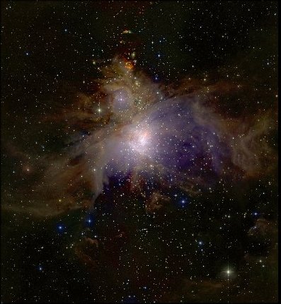 A famosa nebulosa de Orionte não podia deixar de ter sido observada pelo 2 Micron All Sky Survey (2MASS), projecto iniciado em 1997 com o objectivo de fazer um mapeamento completo do céu na banda do infravermelho. Também conhecida por M 42, a nebulosa de Orionte é uma região HII, ou seja, uma região de hidrogénio ionizado, que está a ser excitada pelas estrelas do enxame do Trapézio. Este enxame pode ser visto no centro da nebulosa e, embora só algumas estrelas sejam visíveis, ele contém mais de 3000 estrelas. M 42, situada a cerca de 1500 anos-luz de distância da Terra, é um autêntico berçário de estrelas, sendo um excelente laboratório para estudos dos estágios iniciais de formação de estrelas.