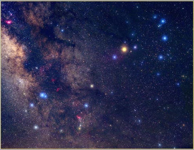 Imagem da constelação do Escorpião. As estrelas mais brilhantes, normalmente utilizadas para identificar a constelação, surgem bem destacadas. Existem muitos objectos de interesse nesta região do céu, nomeadamente um grande número de enxames de estrelas. A nebulosidade, intercalada com nuvens escuras de gás e poeira, que preenche a zona esquerda da imagem é parte da nossa Galáxia, a Via Láctea. A estrela brilhante e de cor alaranjada perto do centro da imagem é Antares, a 15ª estrela mais brilhante do céu nocturno. Antares a cerca de 500 anos-luz de distância, é uma estrela super-gigante vermelha com cerca de 15 vezes a massa, 700 vezes o diâmetro e 10 000 vezes o brilho do nosso Sol. O seu nome é de origem grega e significa anti-Ares, ou seja anti-Marte, pois possui uma cor e brilho semelhantes aos do planeta Marte, podendo por vezes ser confundida com este.