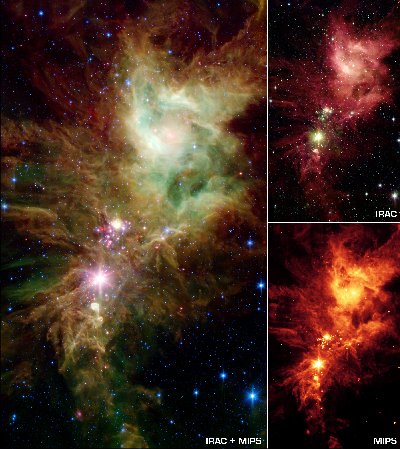 Que imagem mais apropriada para a quadra que atravessamos do que a de NGC 2264, uma nebulosa de emissão conhecida por "Nebulosa da Árvore de Natal"? A imagem de hoje foi agora tornada pública pela equipa responsável pelo Telescópio Espacial Spitzer, um telescópio de infravermelhos, capaz de captar imagens de estrelas jovens em formação envoltas no denso nevoeiro proto-estelar. Nela pode-se ver o enxame de estrelas com o mesmo nome, situado a cerca de 2500 anos-luz de distância e com uma idade estimada de 5 milhões de anos. Este enxame é tão jovem que a maior parte das suas estrelas ainda têm discos circum-estelares à sua volta. Na verdade, esta nova e espectacular imagem revela a presença de um enxame de estrelas muito jovens, com apenas 100000 anos de idade, visíveis na imagem como pontos luminosos cor-de-rosa. Estas aparecem espaçadas de uma forma regular, qual pequenos flocos de neve dispostos numa árvore de Natal, pelo que o novo enxame foi baptizado de "Enxame de Flocos de Neve". Na mesma região pode-se ainda encontrar a famosa nebulosa do Cone, visível em baixo, do lado esquerdo das imagens. A imagem maior resulta da combinação das duas imagens à direita obtidas com dois instrumentos diferentes. Estas foram obtidas por uma equipa de astrónomos cujo trabalho que resultou nesta descoberta foi protagonizado por Paula Teixeira, jovem astrofísica portuguesa a realizar doutoramento nos Estados Unidos da América.