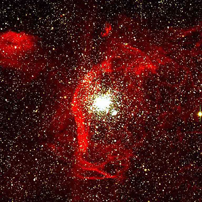 NGC 1850 é um duplo enxame de estrelas na Grande Nuvem de Magalhães, uma galáxia satélite da Via Láctea a 168 000 anos-luz. Este aglomerado de estrelas é representativo de uma classe de objectos que não tem contrapartida na nossa Galáxia. A peculiariedade de NGC 1850 reside em ter uma natureza dupla: é composta por um enxame globular principal, com cerca de 40 milhões de anos, e um segundo aglomerado, também globular, menor, com apenas 4 milhões de anos e que é essencialmente composto por estrelas extremamente quentes. Estima-se que cerca de 1000 estrelas no aglomerado principal tenham explodido como supernovas nos últimos 20 milhões de anos. Uma teoria propõe que a formação do enxame mais jovem terá sido provocada pelo efeito das supernovas nas nuvens de gás residual à volta do enxame principal. Na imagem, o hidrogénio brilha a vermelho, mostrando que ainda resta muito gás na região. Embora parte deste possa ainda pertencer à nuvem mãe, donde nasceram os dois enxames, a estrutura do gás, com a presença de filamentos, favorece a teoria das supernovas.