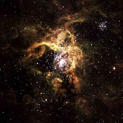 Esta nebulosa, também conhecida por 30 Doradus, ou ainda pelo número de catálogo NGC 2070, encontra-se na constelação do Dourado e pertence à Grande Nuvem de Magalhães, uma das nossas galáxias satélite, a uma distância de 170 000 anos-luz. Esta nebulosa é uma das regiões de formação estelar mais extensas que se conhecem no nosso Grupo Local de galáxias. Começou por ser catalogada como uma estrela, mas foi depois reconhecida como nebulosa pelo astrónomo francês A. Lacaille, em 1751-1752. A nebulosa da Tarântula é a única nebulosa extragaláctica que pode ser observada à vista desarmada. No seu centro, encontra-se um aglomerado estelar aberto, R 136, contendo muitas das estrela maiores, mais quentes e com maior massa que se conhecem. Esta imagem, obtida com o telescópio Kueyen de 8,2 m de diâmetro do VLT em 2000 é uma composição de 3 exposições nos filtros B (30 s, qualidade de imagem de 0,75 segundos de arco), V (15 s, qualidade de 0,70 segundos de arco), e R (10 s, qualidade 0,60 segundos de arco).