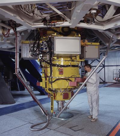 Vista geral do instrumento FOcal Reducer & low dispersion Spectrograph (FORS1), de cor amarela, colocado no foco Cassegrain do UT1, o primeiro dos quatro telescópios que constituem o
