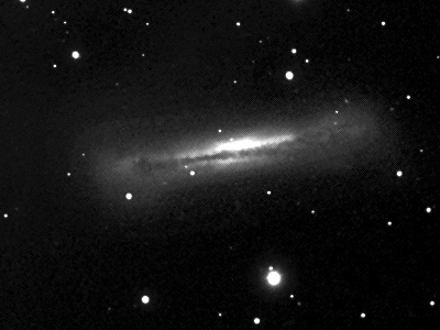 Nesta imagem, obtida pelo astrónomo amador Paulo Bénard Guedes com um telescópio de 10cm no dia 12 de Fevereiro, a zona de poeira equatorial que impede a visibilidade da zona mais central da galáxia é facilmente visível, assim como a sua forma deformada. Esta deformação deve-se a interacções gravíticas com as duas galáxias vizinhas M65 e M66. A imagem é uma composição de 29 fotografias individuais de 3 minutos de duração cada, processadas digitalmente, que foram obtidas com uma câmara Atik ATK-2HS com um filtro de bloqueio IR.