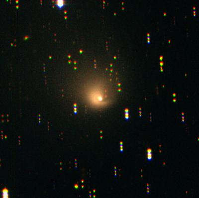 O cometa Hale-Bopp enriqueceu as nossas noites quando passou pelo sistema solar interior em 1997. Observável a olho nu, era a imagem de um cometa clássico, com uma cabeça brilhante e uma extensa cauda. Depois, seguiu o seu trajecto afastando-se do Sol, e em Março de 2001 encontrava-se a meio caminho entre as órbitas de Saturno e Úrano. Devido à elevada inclinação da sua órbita, podia ser visto a sul da Grande Nuvem de Magalhães, na constelação do Dourado. Esta imagem, obtida em Março de 2001, mostra que o famoso cometa ainda se encontrava activo apesar de se situar a 2 mil milhões de quilómetros do Sol. Repare-se na enorme coma que ainda possui, e no jacto encurvado na coma, formado por poeira e gás a escapar-se do núcleo. A extensão total do cometa é ainda de pelo menos 2 milhões de quilómetros. Esta imagem é uma composição de exposições obtidas em 3 noites diferentes. Devido ao movimento do cometa durante esse tempo, aparecem várias imagens de cada estrela na composição final.