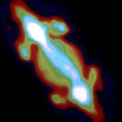 Não parece, mas é! Esta é uma imagem do planeta Júpiter, obtida com o conjunto de radiotelescópios conhecido por VLA (Very Large Array), localizado no Novo México (EUA). Ao contrário das imagens habituais de Júpiter, onde costumam ser visíveis várias faixas coloridas pondo em evidência a complexa atmosfera do planeta, incluindo a famosa Grande Mancha Vermelha, nesta imagem rádio em cor falsa é posta em evidência a emissão proveniente de electrões energéticos apanhados no campo magnético intenso de Júpiter. A zona emissora de ondas rádio estende-se muito para além da superfície do planeta, e envolve Júpiter como uma versão alargada da cintura de radiação de Van Allen que rodeia a Terra. Embora emita fortemente na banda rádio, esta cintura de radiação é invisível nas habituais imagens ópticas do planeta.