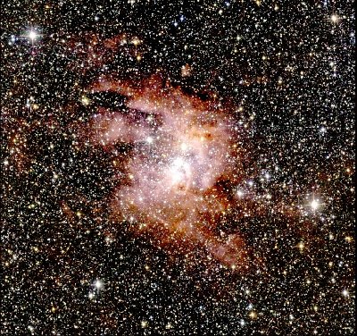 NGC 3603 é a maior região HII (região de hidrogénio ionizado) existente na Via Láctea, ocupando cerca de 20 anos-luz de extensão. Situada no braço espiral da Carina da Galáxia, a uma distância de cerca 20000 anos-luz de nós, esta nebulosa está a ser ionizada por um enorme enxame de estrelas jovens maciças e muito quentes, visíveis na região central desta imagem de infravermelho do 2MASS. Observações recentes revelaram que no interior desta nebulosa habitam estrelas jovens de baixa massa, com menos de um milhão de anos de idade, bem como estrelas gigantes e extremamente maciças. É conhecida também a exitência de uma estrela que se pensa estar prestes a explodir sob a forma de supernova.