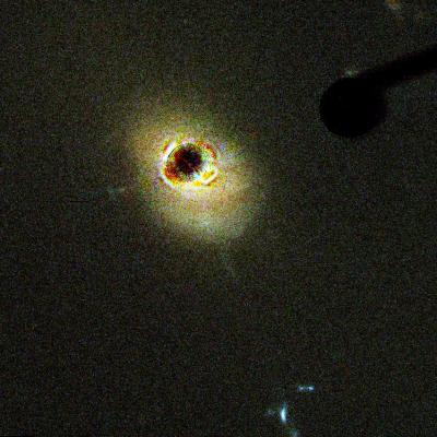 3C 273 é um quasar próximo, a 1,9 mil milhões de anos-luz (580 Mpc), na constelação da Virgem. Nesta imagem obtida pelo telescópio Hubble, o coronógrafo foi utilizado para bloquear a luz central do quasar brilhante, de forma a revelar a galáxia que o alberga. Descobrem-se particularidades que tornam a galáxia bastante mais complexa do que se julgava. Destaca-se a estrutura espiral à volta do quasar, atravessada por uma ténue faixa vermelha de poeira; mais abaixo, na direcção do jacto emitido pelo quasar, um nódulo e um arco azul. A peça do coronógrafo que oculta o centro do quasar vê-se a preto, assim como uma outra mancha à direita, também causada pelo coronógrafo. Os quasares foram descobertos em 1960, mas passaram-se pelo menos duas décadas até os astrónomos terem evidências observacionais de que eles residem em galáxias. Hoje, é aceite que são buracos negros de massa extremamente elevada que se alimentam de gás e poeira das galáxias que os albergam.