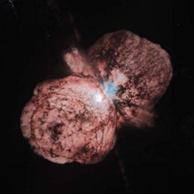 Na constelação da Quilha e a 8 mil anos-luz, encontra-se a estrela peculiar Eta Carinae, primeiro catalogada por E. Halley em 1677. Registos históricos mostram que, em 1843, uma grande erupção tornou-a a estrela mais brilhante do céu a seguir a Sírio, atingindo magnitude -1. Lentamente, a estrela foi diminuindo de brilho e, 25 anos depois, nem era visível a olho nu. Desde então, outras erupções menores ocorreram e a sua variabilidade tem deixado os astrónomos perplexos. Durante a Grande Erupção (assim ficou conhecido o fenómeno de 1843), uma enorme quantidade de material estelar foi ejectado e formou uma nebulosa bipolar que se estende por cerca de meio ano-luz. Esta imagem obtida pelo Hubble em 1996 permite distinguir estruturas - faixas, condensações e filamentos de gás e poeira - com apenas 15 mil milhões de quilómetros de extensão. A imagem revela que a luz ultravioleta escapa ao longo do plano equatorial, entre os lóbulos bipolares, onde aparentemente há pouca poeira, contrariamente aos lóbulos, cuja cor vermelha indica a forte presença de poeira. Esta estrela, no fim da sua vida, permanece um dos grandes mistérios da astronomia estelar, não se sabendo se se trata de uma só estrela de massa muito elevada, ou dum sistema binário.