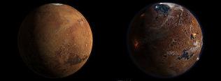 Imagem artística do globo de Marte no presente (à esquerda) e há 3500 milhões de anos (à direita). Créditos: Space4Case.